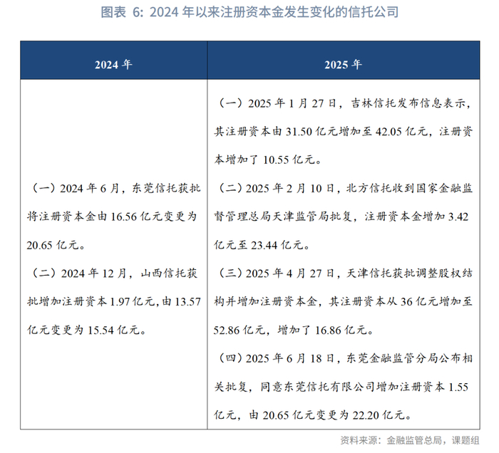 但2025年开年至今,东莞信托、吉林信托、北方信托等5家机构累计增资超32亿元,已远超2024年全年水平。